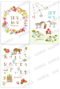 花いっぱいの華やかな年賀状、おみくじを引く馬たちがかわいい年賀状、お正月モチーフと「あけましておめでとうございます」の文字をデザインした年賀状の3種類が仕上がりました。